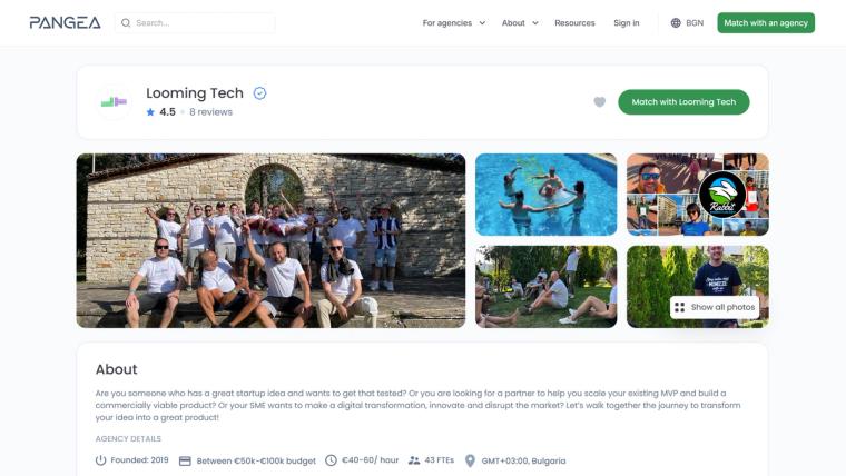 London, Sofia, 21st of October 2022, - we are proud to announce that Looming.Tech successfully verified as a Pangea vendor. This means that we have joined an elite community of the top 7% of software engineering vendors. This will enable us to provide unparalleled transparency about our organization through our Pangea profile for both current and future Looming partners.