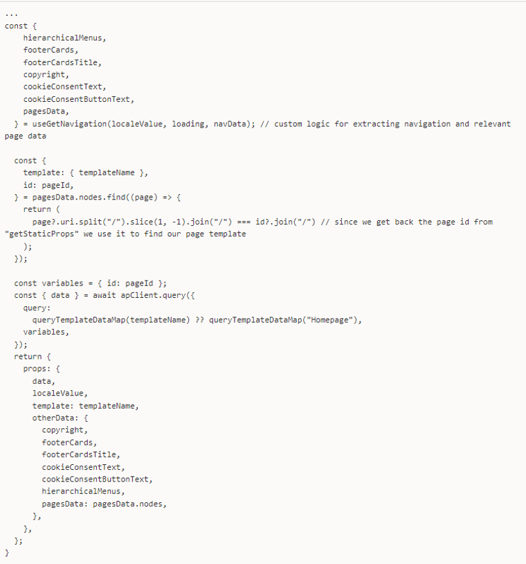 And if you export getStaticProps from a page, Next.js will pre-render this page at build time using the props returned by getStaticProps. Also since we rely on the page id to find it's template, we use the context of getStaticProps, passed down to us by getStaticPaths.